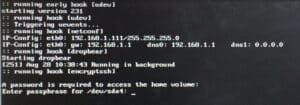 Abhilfe hierfür bietet der lightweight SSH-Server Dropbear, welchen man im initramfs installieren kann. Zusätzlich sorgt man dafür, dass das Netzwerk-Interface gestartet wird und gibt die verschlüsselte Partition an.