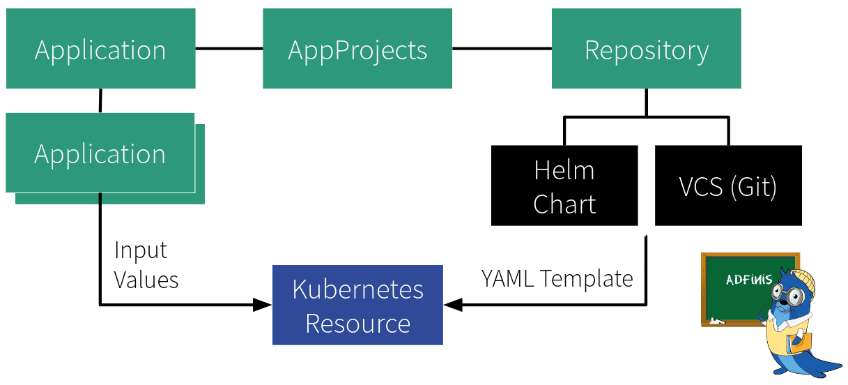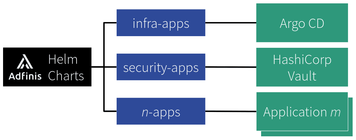 The App of Apps approach is especially useful to categorise and structure applications in a way such that they “work well together”. At Adfinis we maintain an opinionated version of this categorisation in Applications with “umbrella charts”, where each Application chart may have multiple subcharts, which represent the actual target Application.