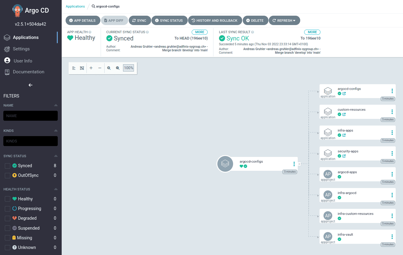 After these initial configuration steps, the first Application is used as an abstract container to keep all configuration objects in sync. This is called the “App of Apps Pattern”, where the first Argo CD app consists only of other apps.