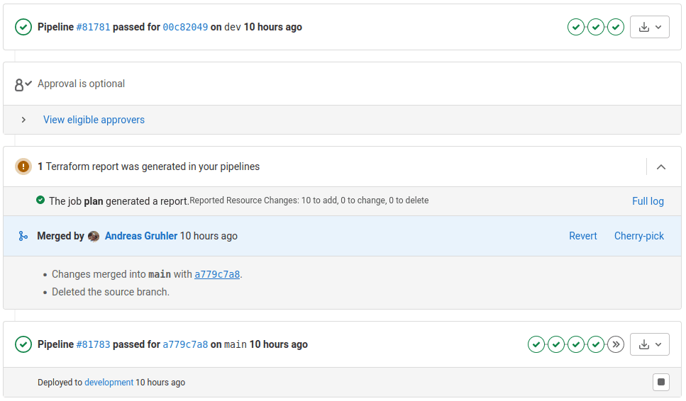 • Use a GitLab pipeline which allows to run the Terraform module in a secure environment and perfectly integrates the Terraform plan and output in GitLab merge requests