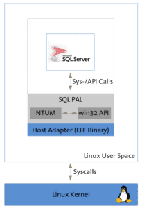 In combination, Drawbridge and SQLOS allow for MSSQL servers to be run in Linux. But in their implementation, they go way too far in some respects and partly solve the same problems. For this reason, the team at Microsoft decided to extract the relevant parts and use Drawbridge, LibOS and the SQLOS abstraction layer to construct a new platform abstraction layer (PAL). This one only contains the ABI and APIs relevant for SQL servers and features everything that's required in order to provide a run-time environment for MSSQL. The bottom layer consists of a Linux binary (in the user space) which initiates the rest of the environment.