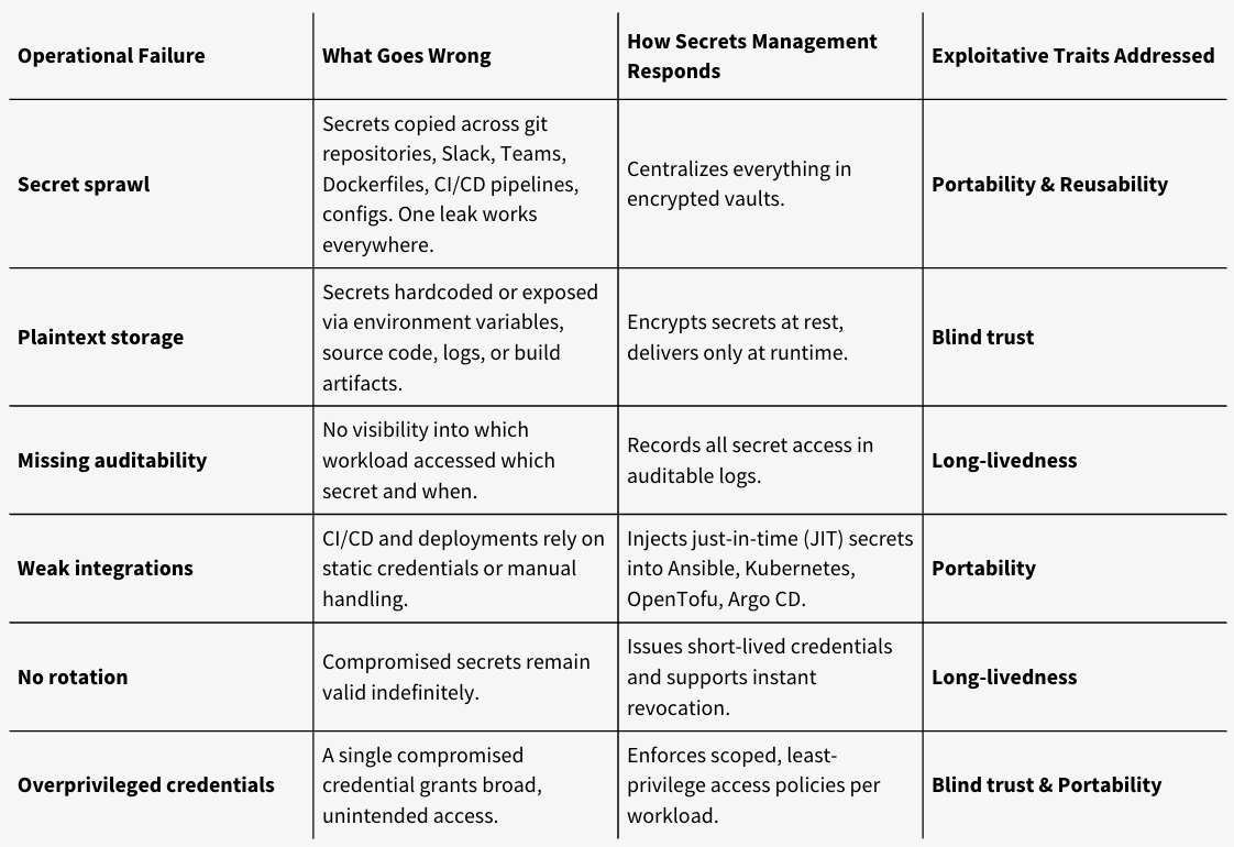 The table below maps common failure modes to the exploitative traits they stem from and the controls secrets management introduces to address them: