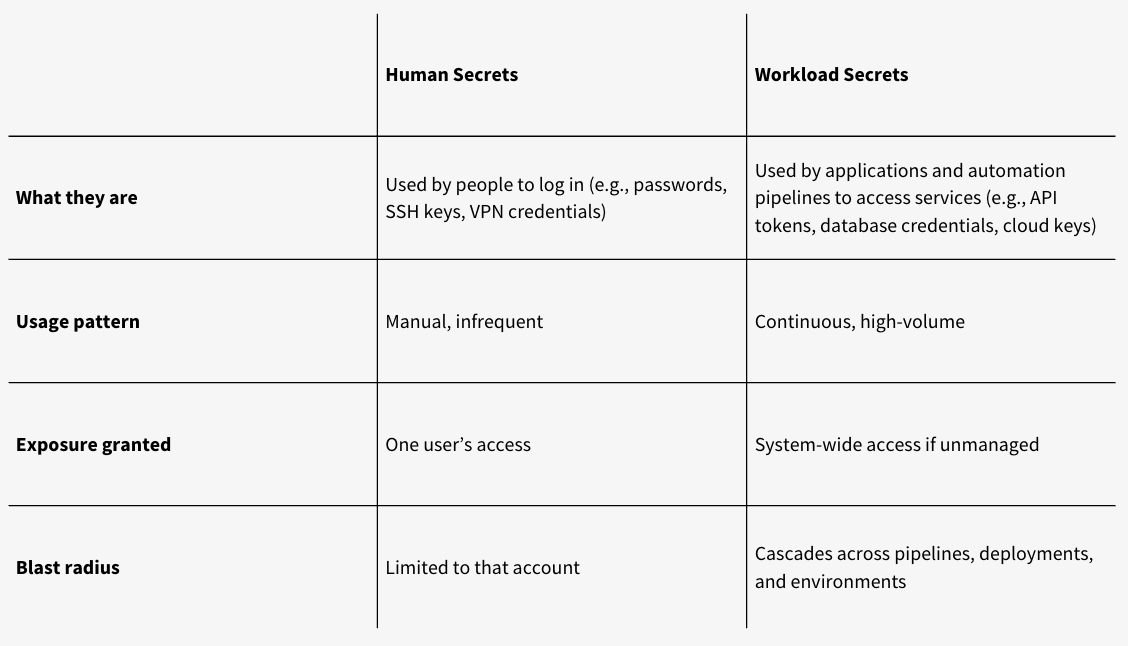Both people and applications use secrets, but scale, speed, and risk profiles differ sharply. Distinguishing between them is important, because they require different management approaches.