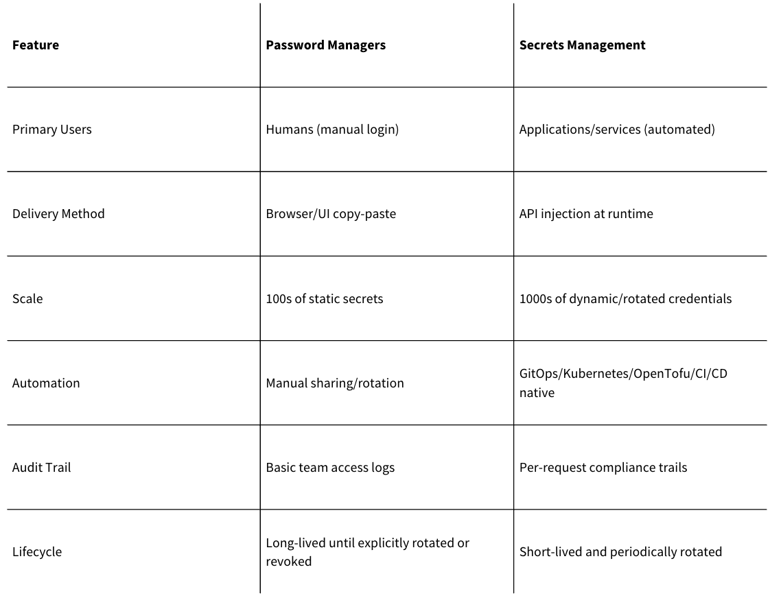 TL;DR: Password managers secure people-to-machine access. Secrets management solutions secure machine-to-machine access. While password managers secure human secrets well, they are not for workload secrets. Workload secrets must be managed with dedicated secrets management.