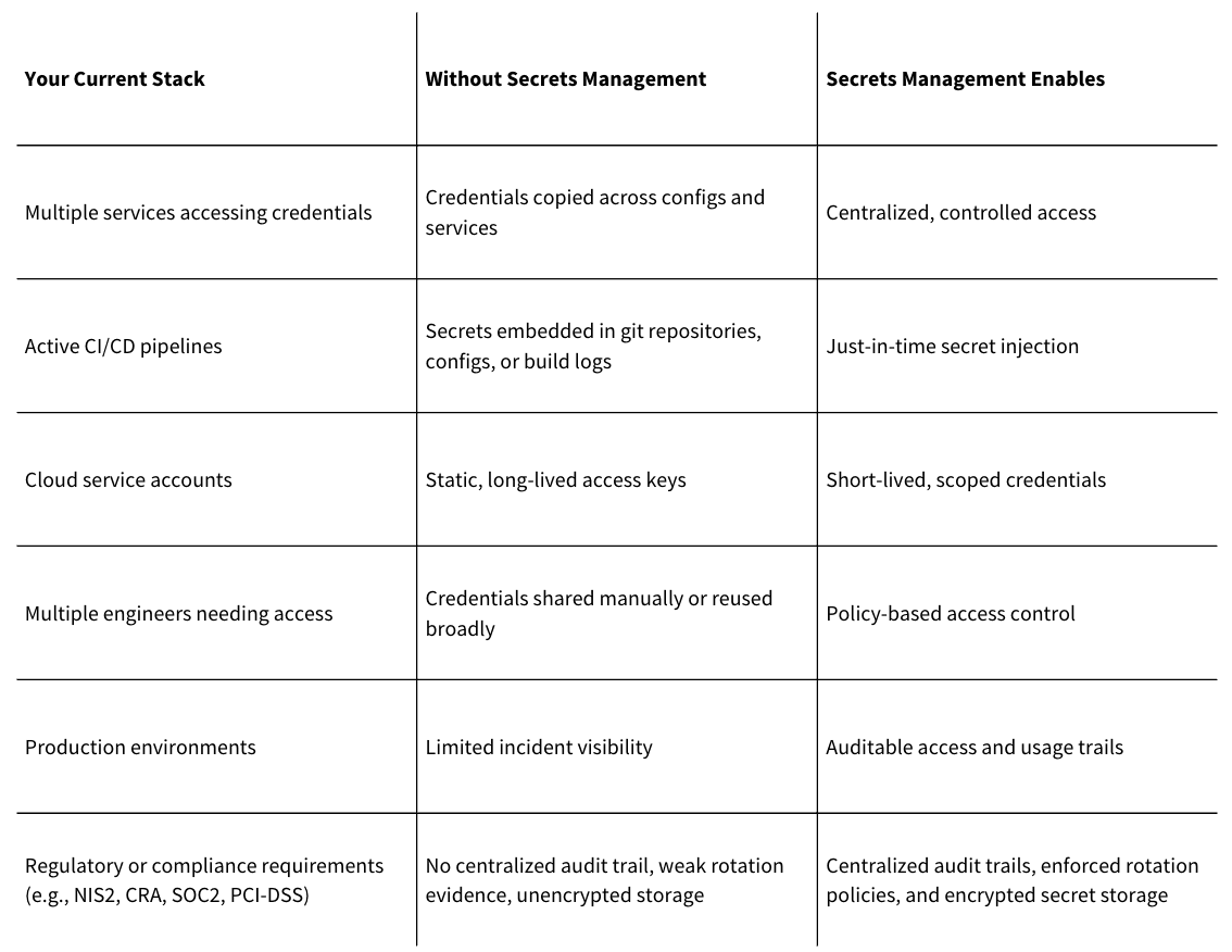 Secrets management becomes necessary when automation outpaces manual control. At that point, managing how workloads authenticate, how long credentials remain valid, and who or what can access them requires centralized policy, auditability, and lifecycle automation.